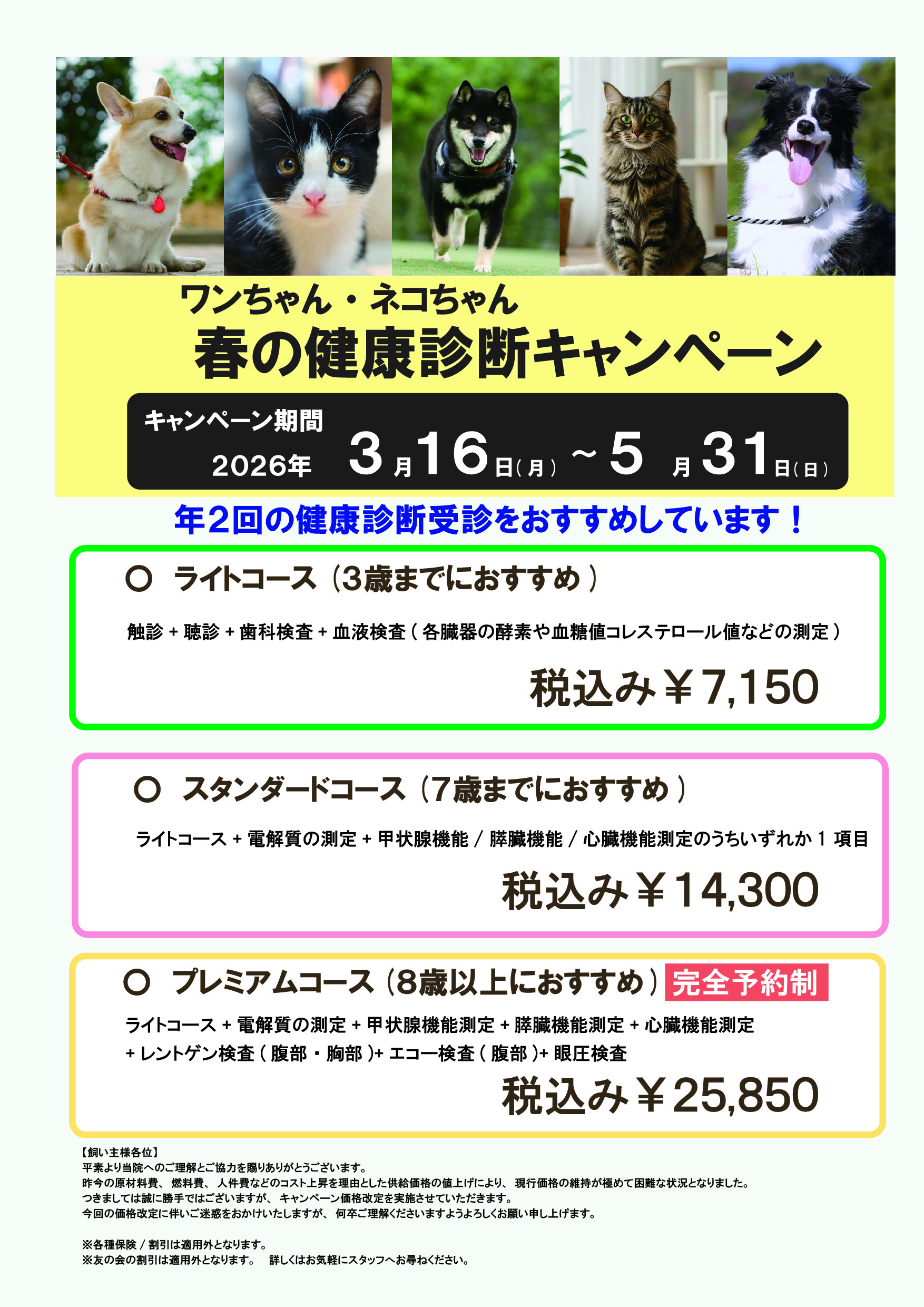 皆様の大切なご家族であるワンちゃん、ネコちゃんの健康維持をサポートし、病気の早期発見・早期治療をするための健康診断を年2回実施しております。